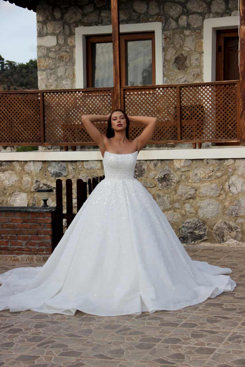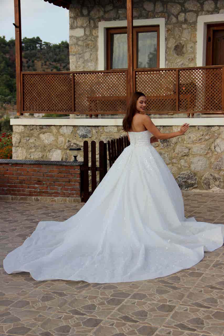 Hilal Model, sade ve zarif detaylarıyla büyüleyici bir gelinlik tasarımıdır. Straplez kesimi, modern bir şıklık sunarken, ışıltılı taş işlemeleriyle göz alıcı bir görünüm yaratır. Prenses kesimi ve uzun kuyruğu, masalsı bir hava katarak her adımda büyüleyici bir etki bırakır. Hilal Model, hem sade hem de ihtişamlı bir stil arayan gelinler için mükemmel bir seçimdir.